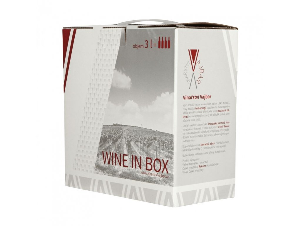 Bag in Box je v překladu pytlík v krabici. Jedná se o velmi moderní způsob balení vín, který úspěšně dobývá nejen restaurace, ale i zahradní párty. Výhodou tohoto obalu je, že se vnitřní sáček smršťuje spolu s vytáčením vína pomocí malé pípy. Nemůže tedy dojít k oxidaci vína a následně k jeho znehodnocení. Navíc velmi praktické, snadno odnositelné a dobře skladovatelné. My jsme Bag in Box překřtili na Wine in Box...