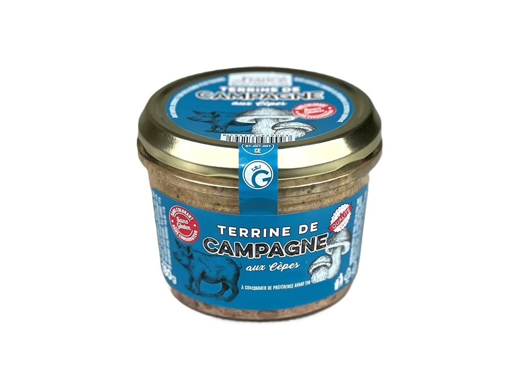 Francouzská terina je tradiční francouzská hrubozrnná paštika. Připravuje se ze vepřového, telecího nebo drůbežího masa, ale také z kachních či husích jater. Tento druh obsahuje větší kousky masa, než je tomu u klasické paštiky. Francouzské paštiky se výrábějí tradiční metodou bez přídavku barviv, konzervantů a emulgátorů. Skladování při teplotě do 25°C. Po otevření uchovávejte při teplotě pod 4°C a spotřebujte do 2-3 dnů. Nejlépe podávejte chlazené.