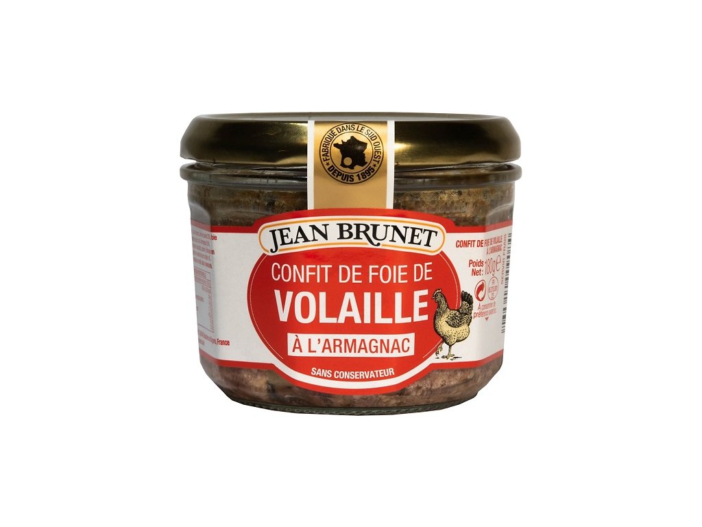Francouzská značka Jean Brunet je dlouholetý výrobce širokého portfolia velmi kvalitních produktů bez jakýchkoliv umělých přísad podle tradičních receptur, které lze použít i na bezlepkovou dietu. Výroba sahá až do roku 1895. Gurmánské speciality a delikatesy nabízí Jean Brunet v široké škále chutí v různých druzích a variantách paštik – teriny, paté, confity a rilety. Confit – naložené kachní nebo husí či jiné maso ve vlastní šťávě s bylinkami, kořením a solí, a následným pomalým dušením v tuku. Naložená kuřecí jatýrka s Armagnacem vybízejí k vychutnání v pohodové atmosféře nejlépe se sklenkou dobrého vína.