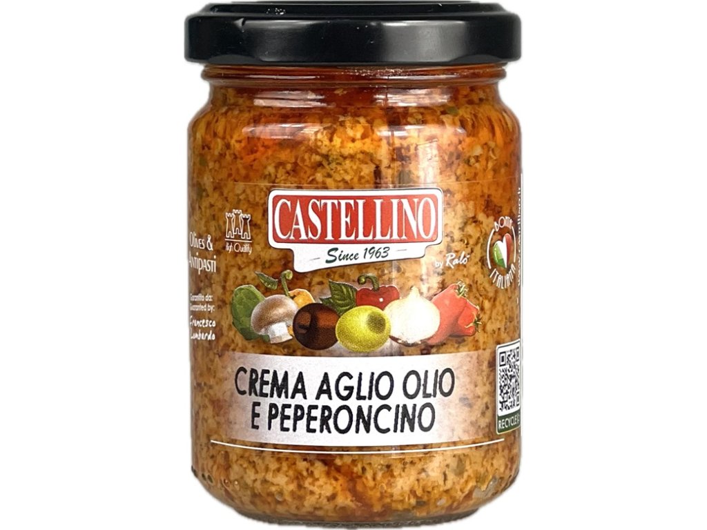 Složení: slunečnicový olej 43%, sušená rajčata 27%, česnek (mimo EU) 24%, sůl, extra panenský olivový olej, chilli paprička 1%, koření, bílý vinný ocet, korektor kyselosti: kyselina citronová, antioxidant: kyselina askorbová. Může obsahovat PŠENICE, MLÉKO, TUŇÁK, MANDLE A KEŠU.