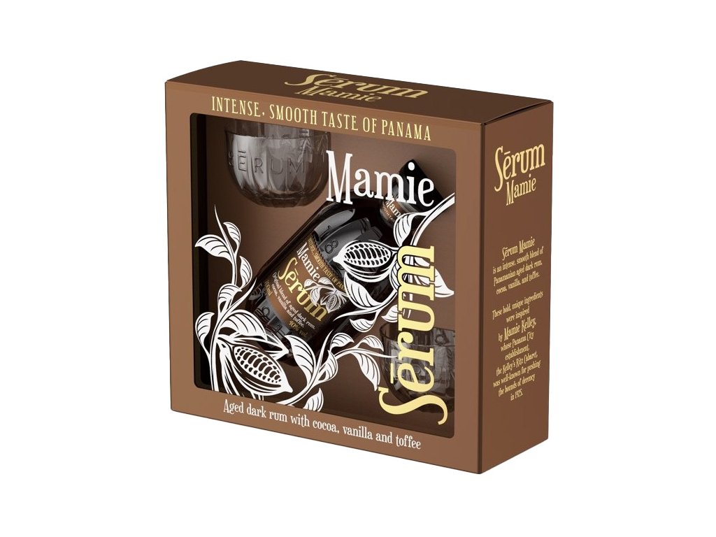 Sérum Mamie Giftset se dvěma skleničkami představuje exkluzivní dárkový balíček, který spojuje výjimečný chuťový zážitek s elegantní prezentací. V jeho středu stojí tmavý panamský rum Sérum Mamie, inspirovaný osobností Mamie Kelly a jejím slavným kabaretem v Panama City z roku 1925. Tento unikátní rum je dochucen směsí kakaa, vanilky a karamelu, které mu propůjčují sametově sladký charakter, podtržený jemnými tóny kávy, mandlí a medu.