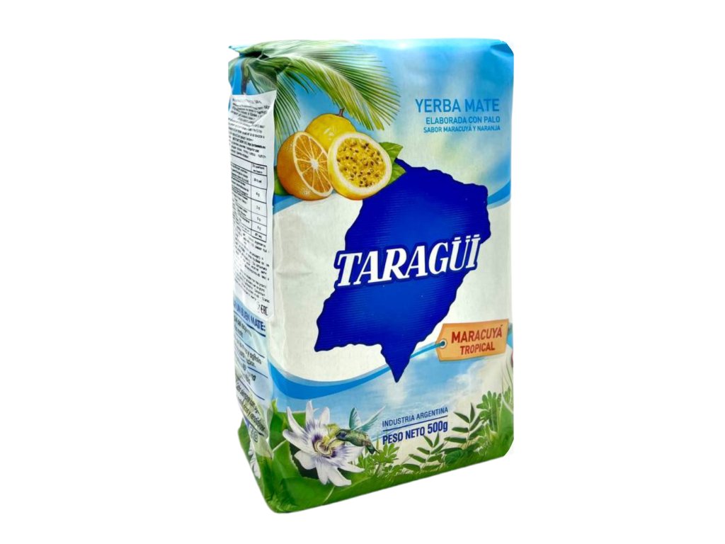 Taragüi Maracuyá Tropical combines high-quality yerba mate with tropical fruits. The dominant flavor of tropical passion fruit (maracuyá) adds sweetness and freshness to the brew. Taragüi is one of the oldest yerba mate brands in Argentina, known for its premium blends and rich tradition.